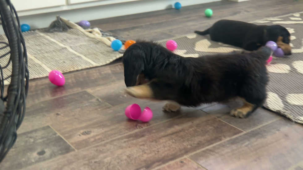Benny is an adorable black and cream long-haired Mini Dachshund boy with a soft, silky coat and a gentle little face that is already winning hearts. At this young age, Benny is spending his days doing what puppies do best, nursing, sleeping, and snuggling close to his mom and littermates as he grows stronger each day.